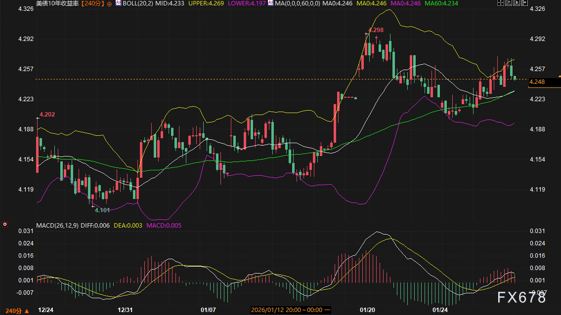 美债收益率曲线陡峭化,为美元带来结构性压力 美元近期的疲软,其根源之一可以从美债市场找到解释。10年期美债收益率在240分钟图上维持在4.246%附近,MACD指标的金叉状态显示短期动能依然偏强。然而,更关键的变化发生在收益率曲线上。知名机构IFR指出,美国国债5年期与30年期收益率利差(5s/30s)自上周低点已再度走阔7个基点。市场下一个焦点将集中在106.5个基点,这是1月6日高点至1月23日低点下跌波段的50%斐波那契回撤位。