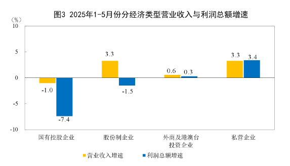 1—5月份,规模以上工业企业中,国有控股企业实现利润总额8709.5亿元,同比下降7.4%;股份制企业实现利润总额20170.7亿元,下降1.5%;外商及港澳台投资企业实现利润总额6856.8亿元,增长0.3%;私营企业实现利润总额7592.5亿元,增长3.4%。