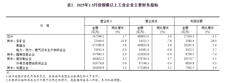 1—5月份,全国规模以上工业企业实现利润总额27204.3亿元,同比下降1.1%(按可比口径计算,详见附注二)。