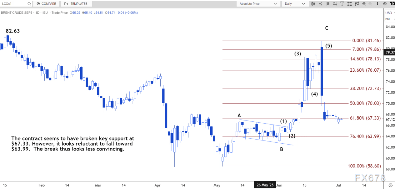 日线图上,该合约似乎已突破67.33美元的关键支撑位。然而,该合约似乎不愿跌向63.99美元。