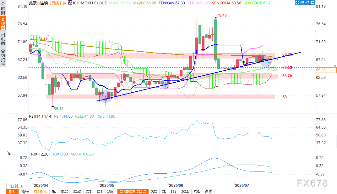 趋势线突破:自2025年5月初起,尽管近期出现波动,WTI原油曾试图维持稳定的上升趋势。但在最新交易日,抛售压力显著上升,打破了此前持续的上升趋势线。若抛压持续,可能引发短期价格走势形成新的看空形态。