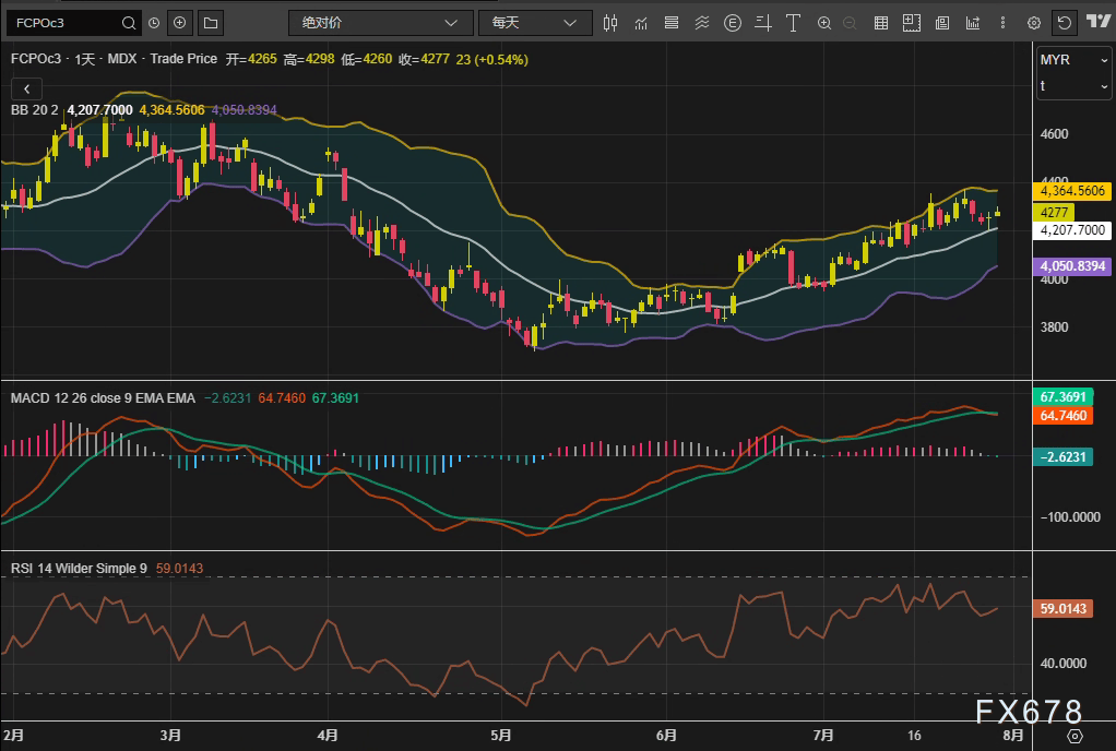MH外汇官网——周三(7月30日),马来西亚衍生品交易所(BMD)棕榈油主力合约FCPOc3延续反弹,10月合约收报4277林吉特/吨,日内涨幅0.54%,连续第二日上行。技术指标显示,价格站稳布林通道中轨(4207林吉特)上方,MACD柱状图收窄至-2.62,RSI(14)维持在59.01的中性偏强区间,短期市场呈现多空拉锯态势。