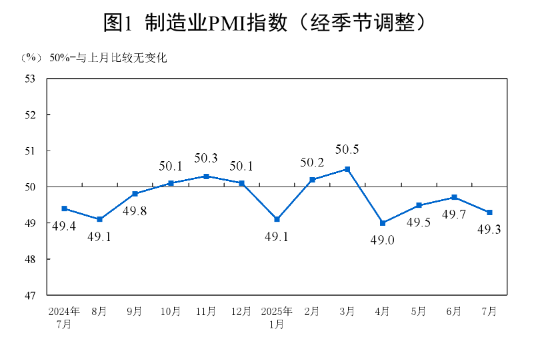 7月份,受制造业进入传统生产淡季,部分地区高温、暴雨洪涝灾害等因素影响,PMI降至49.3%,制造业景气水平较上月回落。