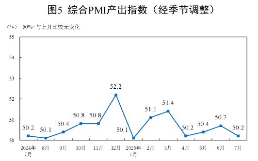 7月份,综合PMI产出指数为50.2%,比上月下降0.5个百分点,仍高于临界点,表明我国企业生产经营活动总体保持扩张。