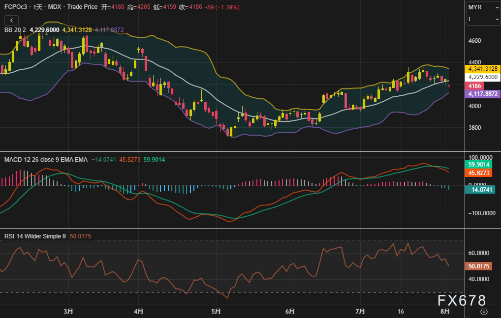 MH外汇官网——周一(8月4日),马来西亚衍生品交易所(BMD)棕榈油主力合约FCPOc3收跌1.39%,报4186林吉特/吨,盘中技术指标呈现多空交织态势:布林带(20,2)中轨位于4341林吉特,而RSI(14)暂稳于50.01中性区间。市场情绪明显受到基本面利空主导,尤其是库存持续累积与产量回升的预期,叠加外围油脂市场疲软,共同压制价格表现。