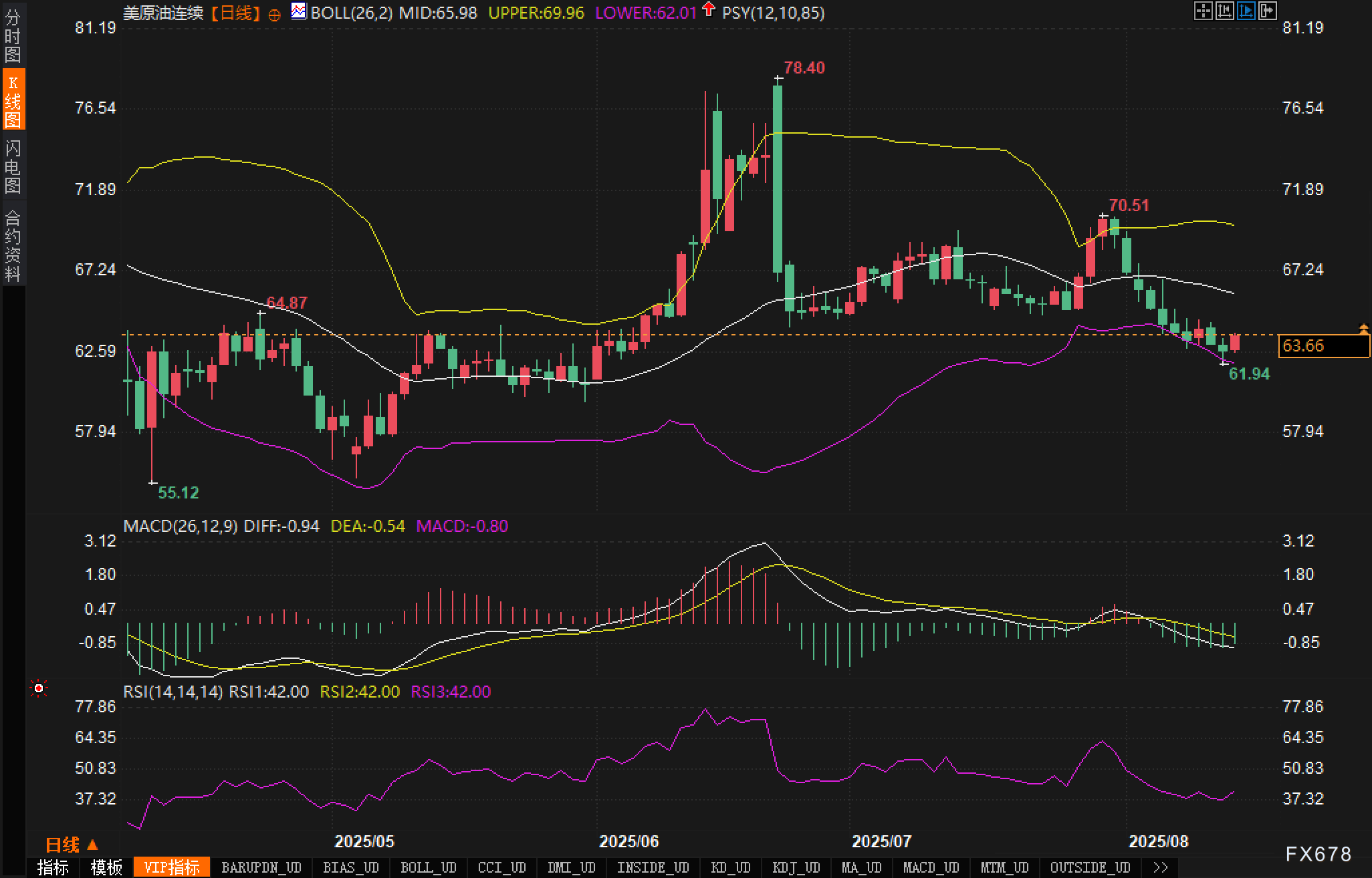 在技术面上,油价在过去几天呈现下跌趋势。当前,油价已接近布林带下轨(62.01美元),显示出短期内油价可能面临一定支撑。MACD指标处于负值区间,且DIFF与DEA之间的差距较大,表明油价短期内可能继续承压。