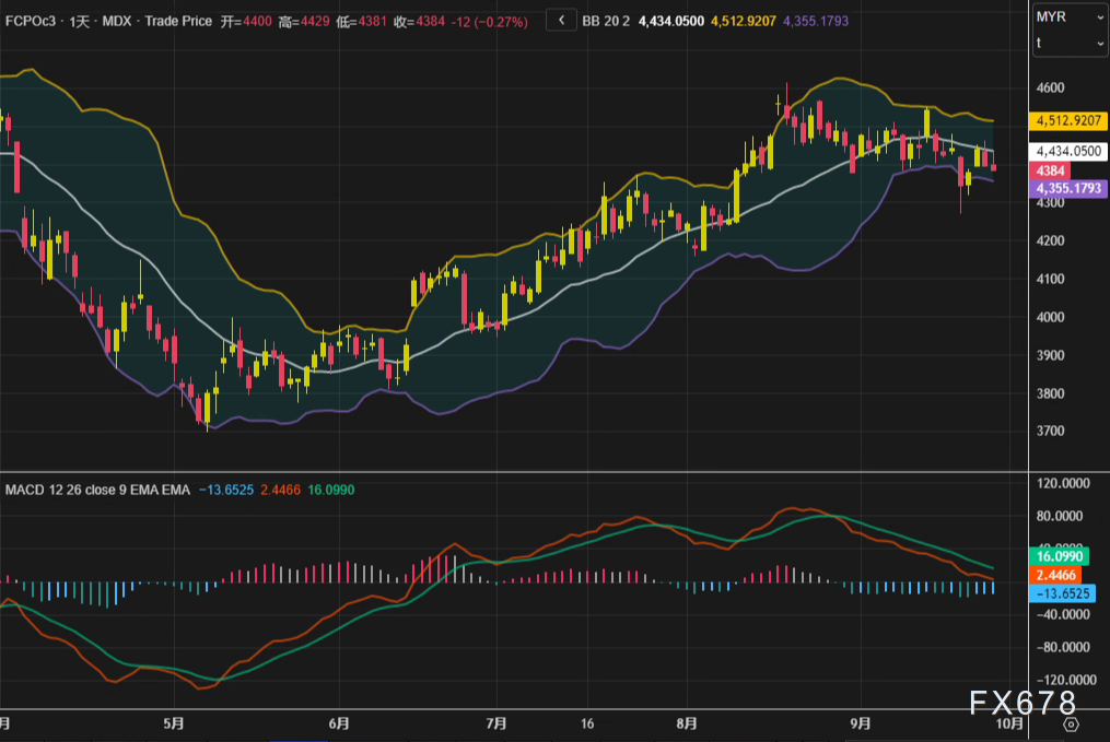 周一(9月29日),马来西亚衍生品交易所基准12月棕榈油期货合约FCPOc3未能延续反弹,在日内震荡后转而收低,最终报收于每吨4384林吉特,较前一交易日下跌12林吉特,跌幅为0.27%。这已是该合约连续第二个交易日收跌。从技术层面审视,日线图上,布林带轨道位于4355.18至4512.92林吉特区间,价格在中轨4434.05林吉特下方运行。MACD指标显示,下跌动能虽仍存在,但其柱状线有所收窄,暗示下行动力可能正在减弱。