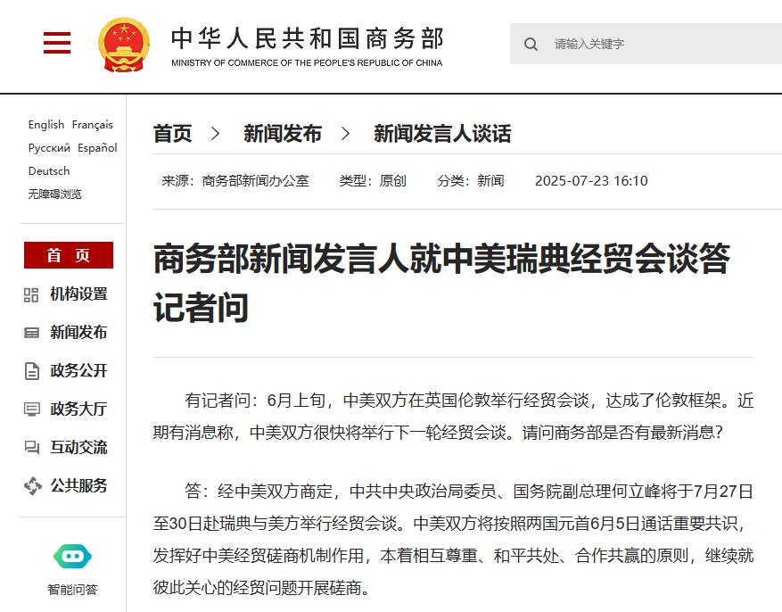 MH外汇官网登陆入口商务部:何立峰将于7月27日至30日赴瑞典与美方举行经贸会谈