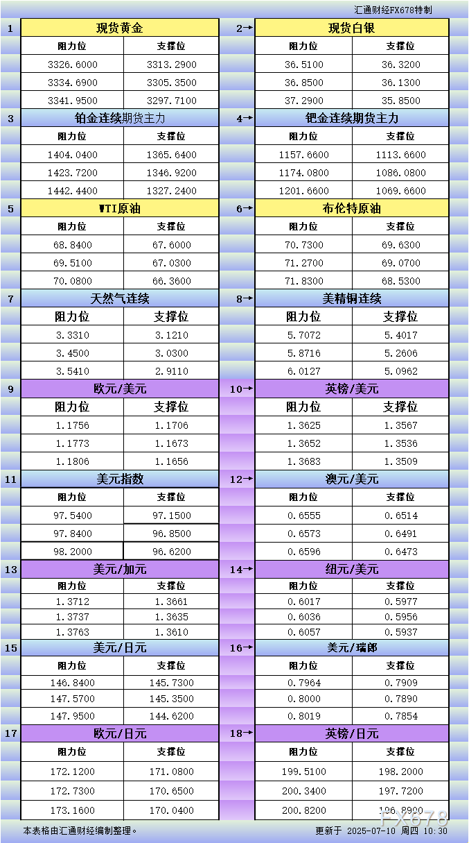 MH外汇官网7月10日亚市更新支撑阻力:18品种支撑阻力(金银铂钯原油天然气铜及