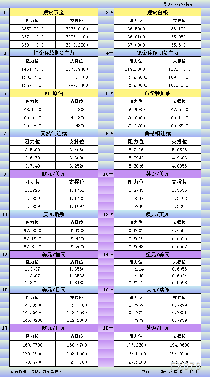 一张图看商品支撑阻力:金银油气+铂钯铜+农产品期货,更新于2025年7月3日周四12:40,具体...