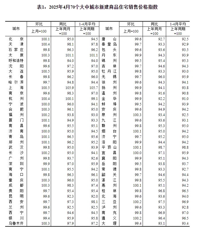 2025年4月份,70个大中城市中,各线城市商品住宅销售价格环比持平或略降,同比降幅均持续收...